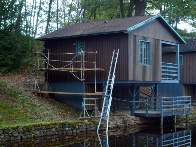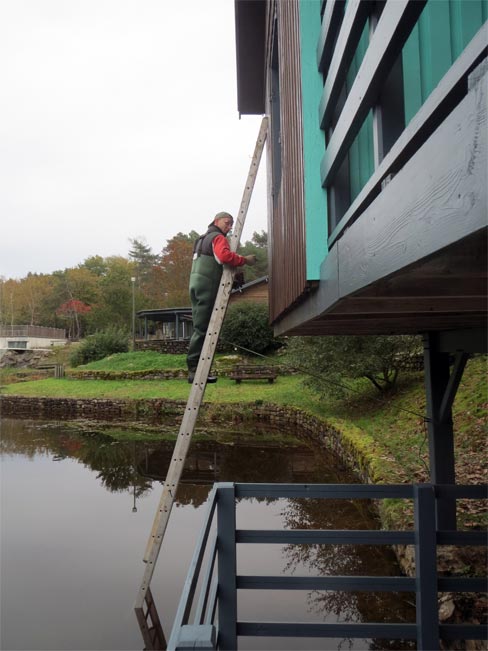 Afin de pouvoir repeindre ces chalets, notamment les parois au dessus de l’eau, la seule solution ne pouvait être que l’installation d’une échelle bien calée au fonds de l’étang (de 1,2m à 1,8m de profondeur selon les endroits) et solidement arrimée à l’armature.