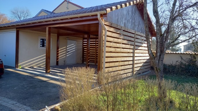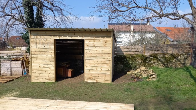 Création de claustras ajourés avec lames de terrasse pour abri à vélos dans un lycéeCréation d’un poulailler de luxe avec toiture bacacierCréation d’un abri à bois en lames de terrasse ajourées et toiture bacacierPose d’un chalet de loisirs sur dalle existanteCréation de claustras pour car-port